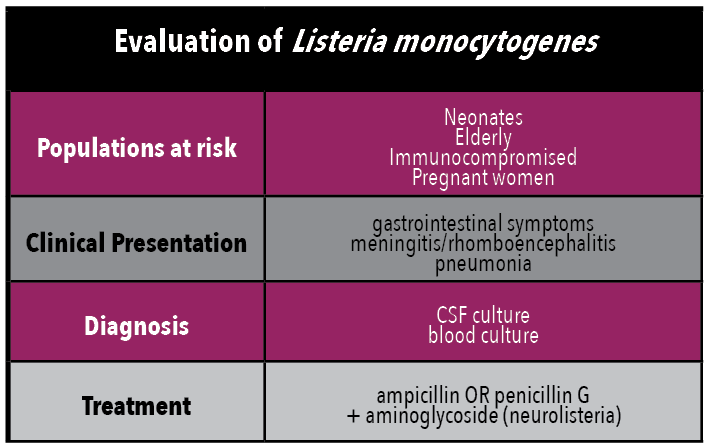 Gelfand M. Clinical manifestations and diagnosis of Listeria monocytogenes infection. UpToDate. https://www.uptodate.com/contents/clinical-manifestations-and-diagnosis-of-listeria-monocytogenes-infection?search=listeria monocytogenes infection&source=search_result&selectedTitle=1~150&usage_type=default&display_rank=1. Accessed December 29, 2019.