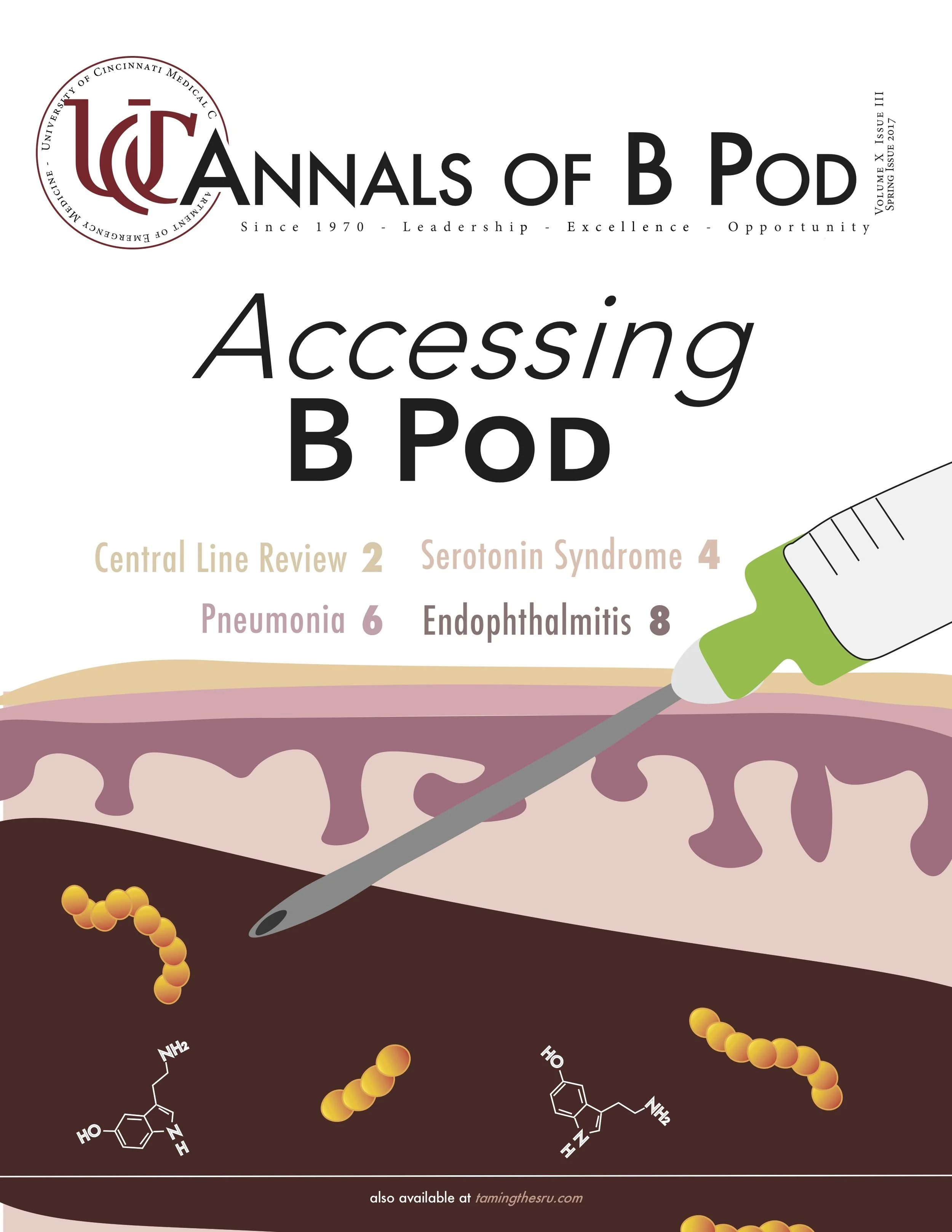 /The topics covered in this Spring’s installment of Annals of B Pod highlight the variety of medical knowledge and procedural skills used daily in the Emergency Department. In B Pod, there may be a patient with an intentional ingestion brought in by EMS next door to a patient with a cough who is discovered to have pneumonia, while on the other side of the pod there is a patient complaining of eye pain. All of these patients represent common chief complaints with broad differentials that interns learn how to work up, manage, and treat. Spring also marks a transitional time, when interns start stepping up to into the junior resident role. With this transition, interns broaden their procedural skill set by learning how to place central lines, perform intubations, and insert chest tubes. As the year progresses, interns see more pathology, learn about new disease processes, and acquire procedural skills.