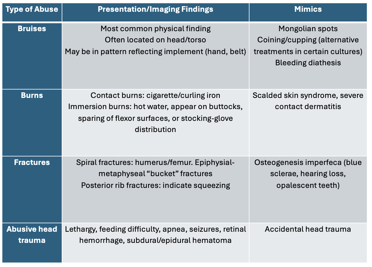 Stop and consider child abuse if the parents’ story is inconsistent with the child’s injury pattern or child’s developmental age (9). For example, stating that a 2-month-old “rolled off the couch” and sustained their presenting injuries is suspicious, as 2-month-olds cannot roll yet. Be weary if the parents’ story continually changes or is very vague. When conducting your history and physical exam, make note of bruising on fleshy areas, distinct patterns of bruises (indicative of object used), bruises of different ages and color, and well-circumscribed burns. If there are any concerning signs of child abuse, make sure to document the appearance of injuries thoroughly by uploading photos to the electronic medical record and describing your findings in your documentation (location, color, size, shape).