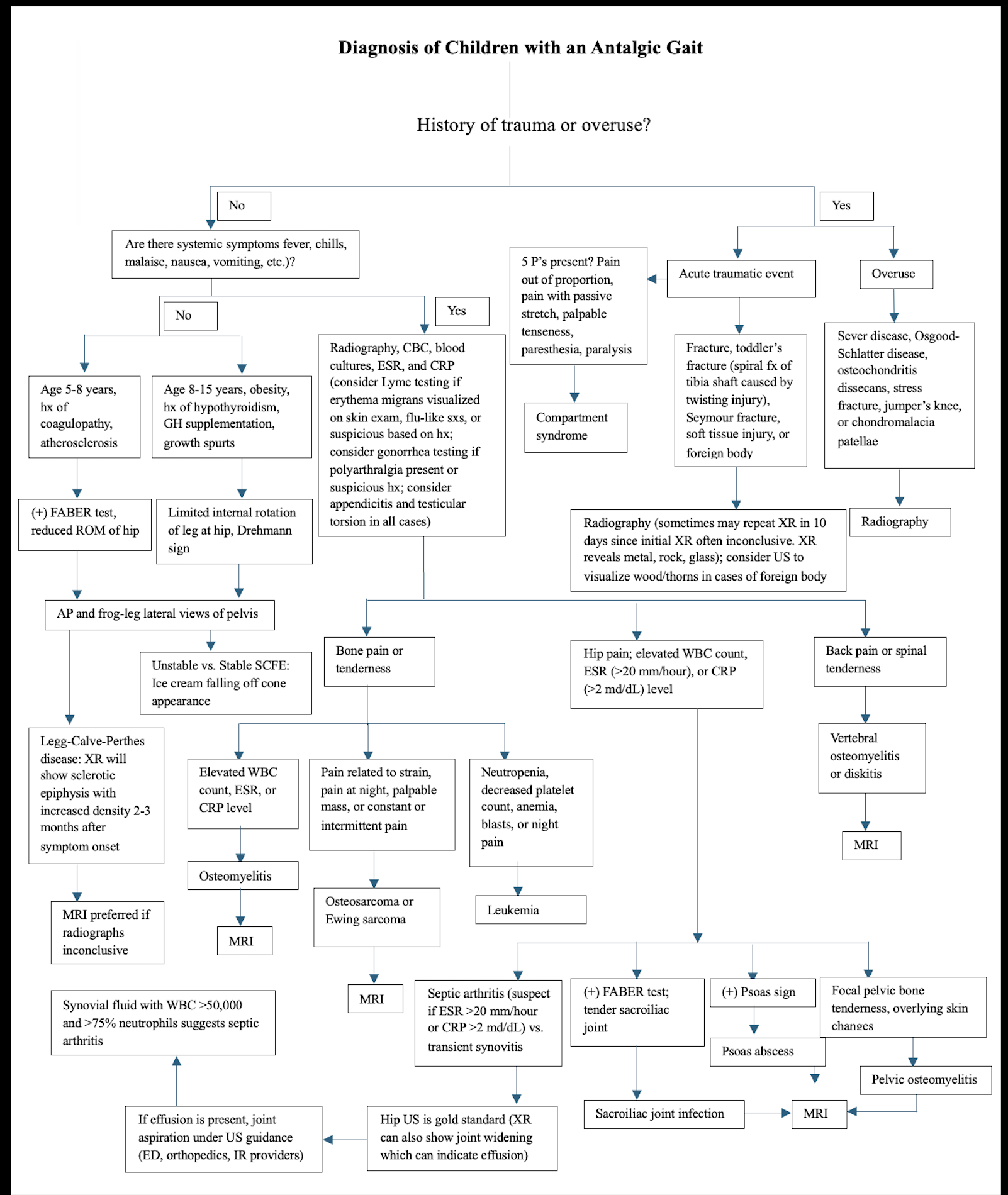 A thorough history and review of systems is of paramount importance in evaluating the pediatric limp. Some specific barriers to consider in the pediatric clinical setting include pre-verbal children and young children coming from environments where parents or caregivers are not present, resulting in gaps in observation of the child. Below is a great reference flowchart for diagnosing pediatric limp in the ER, with a focus on history questions leading to the correct type of work up to pursue.