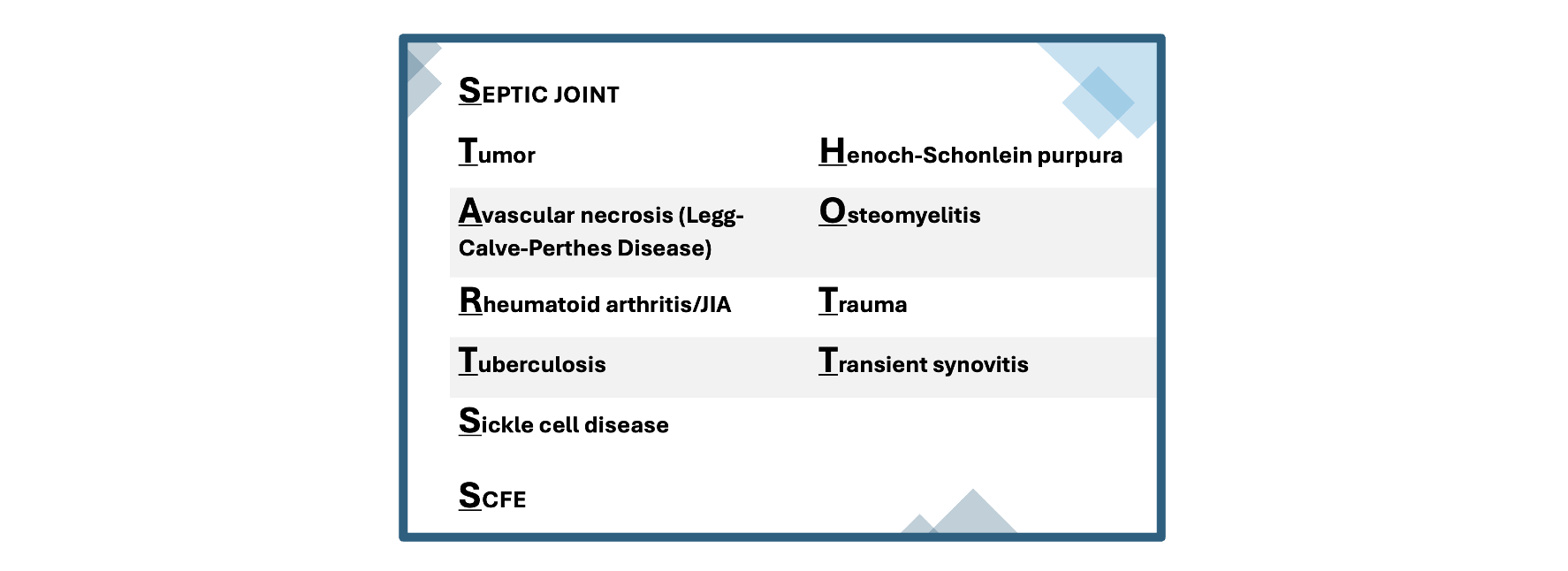 • Toddler aged 3 and under: developmental dysplasia of the hip, congenital limb deficiencies, neuromuscular abnormalities, toddler fracture, septic arthritis, transient synovitis, reactive arthritis, osteomyelitis, foreign object in the knee or foot
