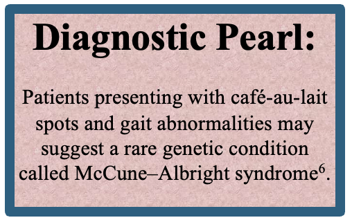 Skin examination: Observe the skin fully for any cutaneous findings, such as café-au-lait spots, hairy patches, sacral dimples, rashes, tick bites, lesions, or bruises. Some of these may signal systemic causes of gait abnormalities that require a more rigorous work-up.