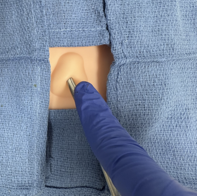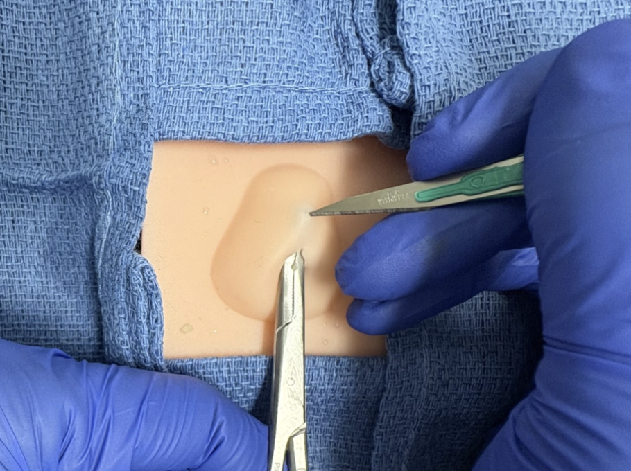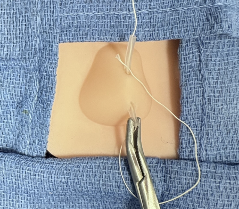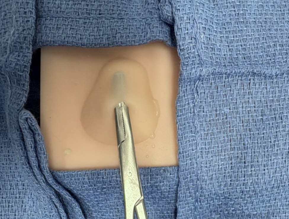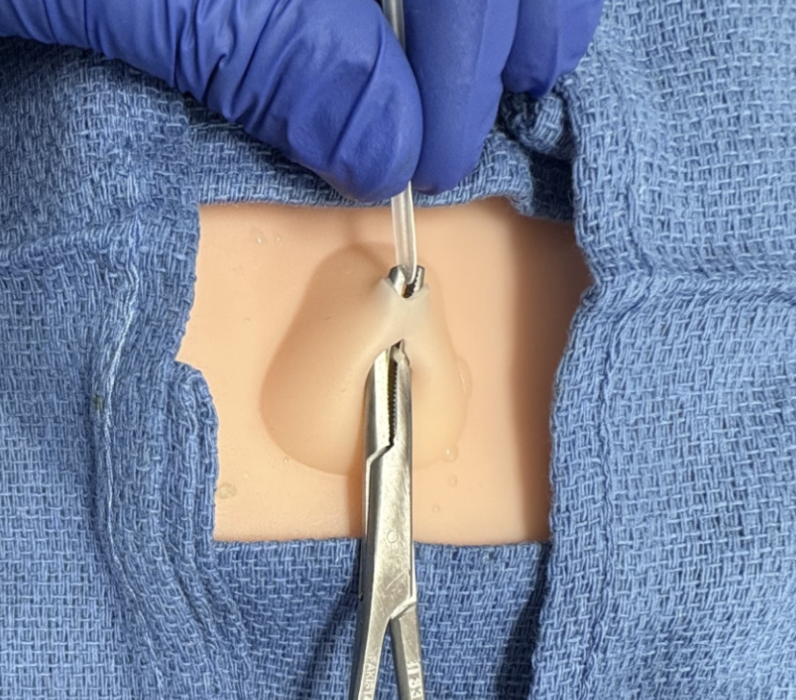 7e. Create a tract with the hemostat and make a second stab incision with the scalpel at the other end of the tract. The second incision should still be in the inner mucosal surface.