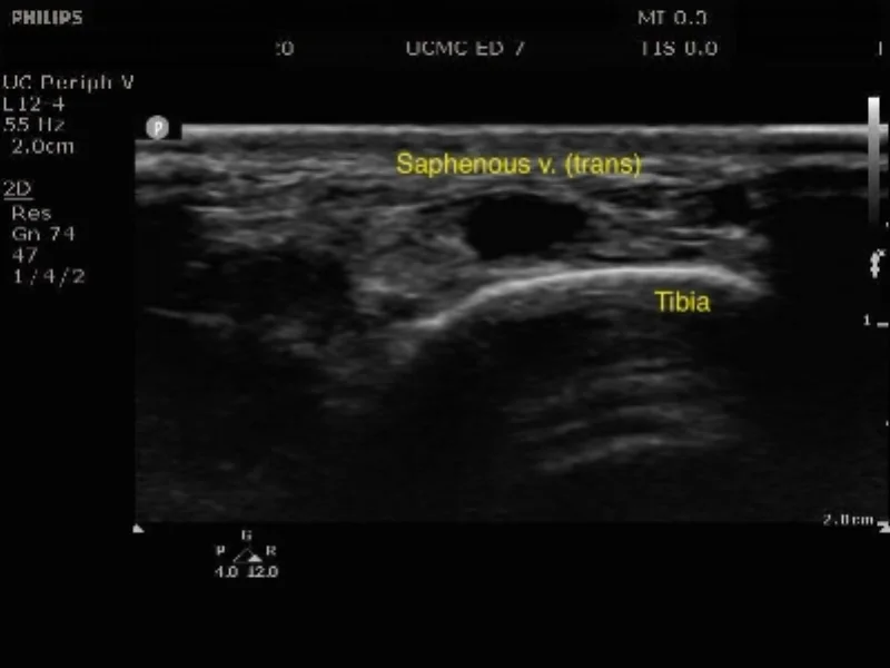 It then occurs to you that in times past a saphenous vein cutdown was a fairly standard technique for vascular access in a challenging patient. Before you decide to break out a 10-blade, remember that you are equipped with an ultrasound machine and an IV catheter...