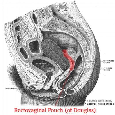 Potential space formed by the reflection of the peritoneum from the rectum to the bladder (or uterus in females). Fluid tends to flow into this area via the right and left paracolic gutters which run from this area in the pelvis into the abdomen, originating in Morison’s pouch and splenorenal recess, respectively.