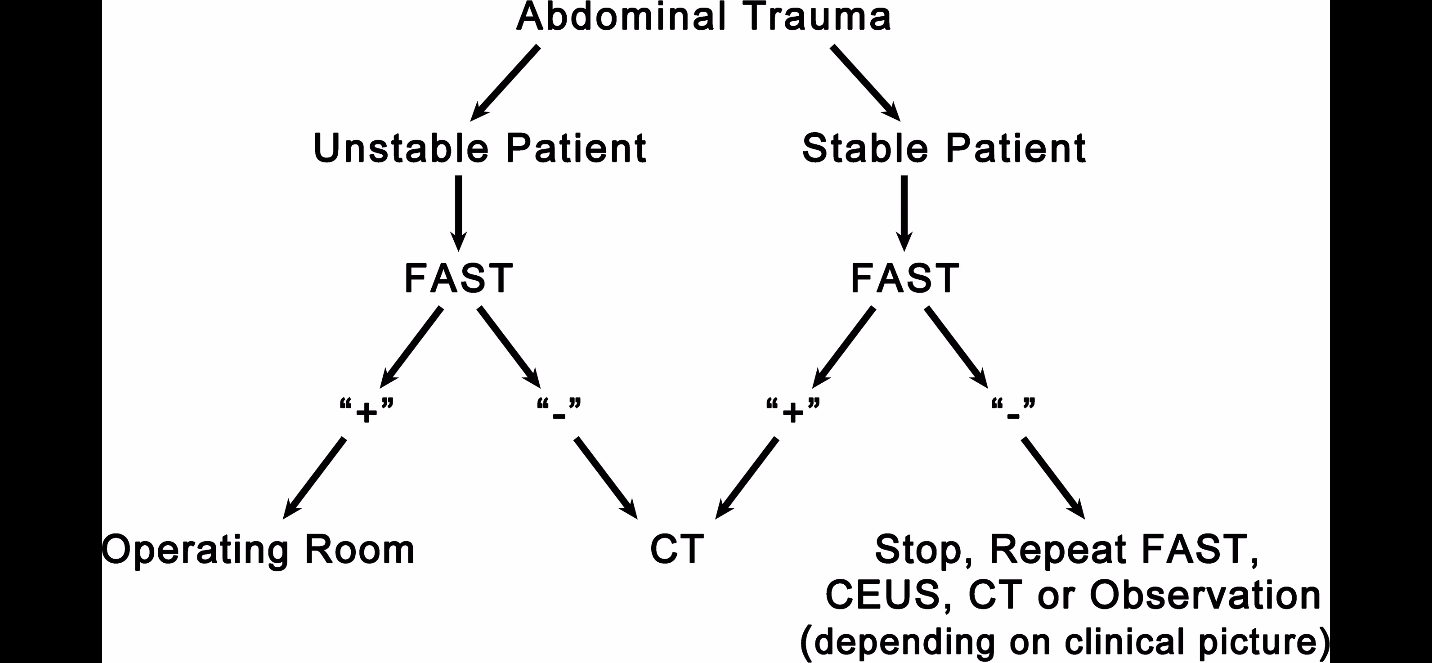 Penetrating abdominal trauma: FAST has less of a role, given the incidence of bowel and other intra-abdominal injury not detected by ultrasound. Overall, this is generally better evaluated by CT, however ultrasound can be helpful in initial bedside evaluation and aid in prioritization of further therapy/diagnostics