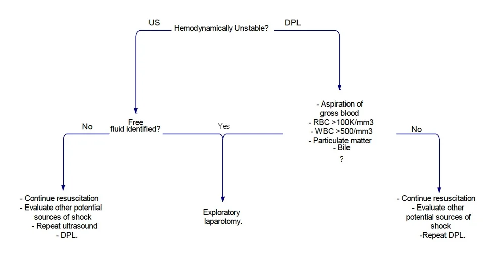 Blunt Abdominal Trauma: This is the primary and historical indication for FAST. In cases of blunt abdominal trauma, FAST is used to determine the presence of intraperitoneal hemorrhage in unstable patient, thus determining need for emergent laparotomy. This has now essentially replaced the role of DPL in evaluation of the trauma patient. FAST can also be used in the stable patient although it is of less predictive utility in assessing need for surgical intervention.